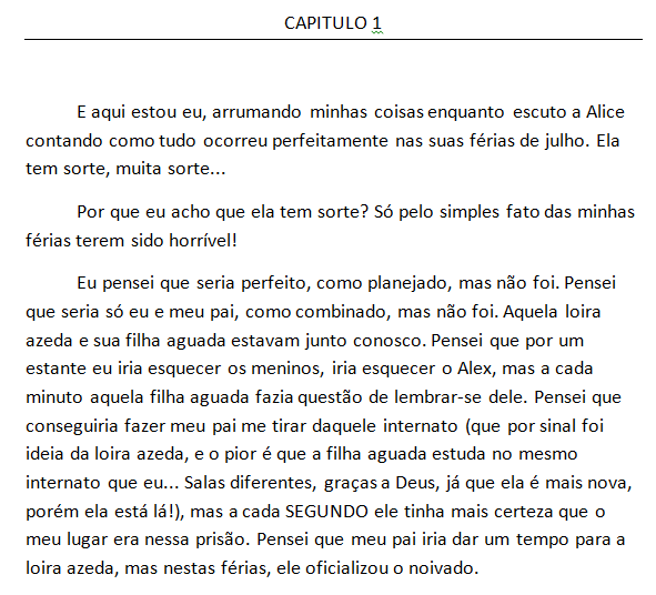 As visualizações não vieram, mas continuei postando até perceber que a história não era tão boa assim. Minha primeira publicação foi literalmente minha primeira tentativa de escrever um livro (mais especificamente, eu terminei o livro em 17/05/2015). A história? Sem profundidade, e um tanto vergonhosa. Para vocês verem que não estou mentindo, eis um trecho: